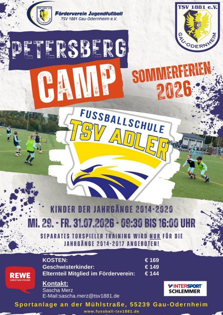 Das sogenannte Petersbergcamp durchzuführen, war schon lange als Idee gereift. Mit der Unterstützung von zehn vereinseigenen, überwiegend lizenzierten Trainern, konnten wir diese Idee endlich in die Tat umsetzen. 73 Kinder nahmen am Camp teil und lernten vier Tage lang einiges dazu. Vor allem aber hatten sie: Jede Menge Spaß! Neben insgesamt acht Trainingseinheiten wurde den Kids ein buntes Rahmenprogramm geboten. So konnten sie das DFB-Fußballabzeichen (für Kinder ab acht Jahren) und das DFB-Paule-Schnupperabzeichen (für Kinder bis sieben Jahren) ablegen, es gab eine kleine Tombola sowie eine Frage- und Antwortrunde mit zwei Spielern der 1. Mannschaft des TSV Gau-Odernheim, Daniel Diel und Lukas Knell.